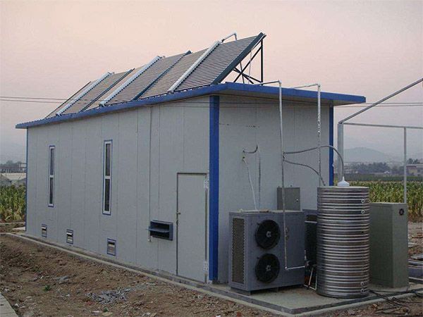 熱泵助推式太陽能烤房主要由太陽能空氣集熱器、空氣源高溫熱泵、智能化烤房系統三部分組成。通過太陽能空氣集熱器對空氣進行加熱,利用循環風機通過管道將高溫空氣傳輸到烤房在烤房內通過太陽能空氣集熱器對 空氣進行加熱,利用循環風機經過管道將高溫空氣傳輸到烤房內;通過溫、濕度感應器檢測,根據所測溫、濕度和干燥工藝,由智能化控制器控制空氣源熱泵的啟、停,排濕門的開、閉、實現全自動干燥。
